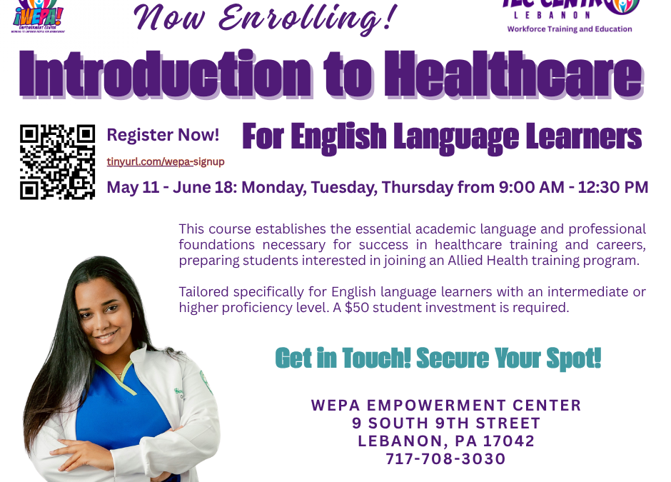 WEPA Empowerment Center is now enrolling students for Introduction to Healthcare for English Language Learners, a foundational course designed to help participants confidently begin their journey toward a healthcare career. Running from May 11 through June 18, classes meet Monday, Tuesday, and Thursday from 9:00 AM to 12:30 PM and focus on building the academic language and professional skills essential for success in allied health training programs.
